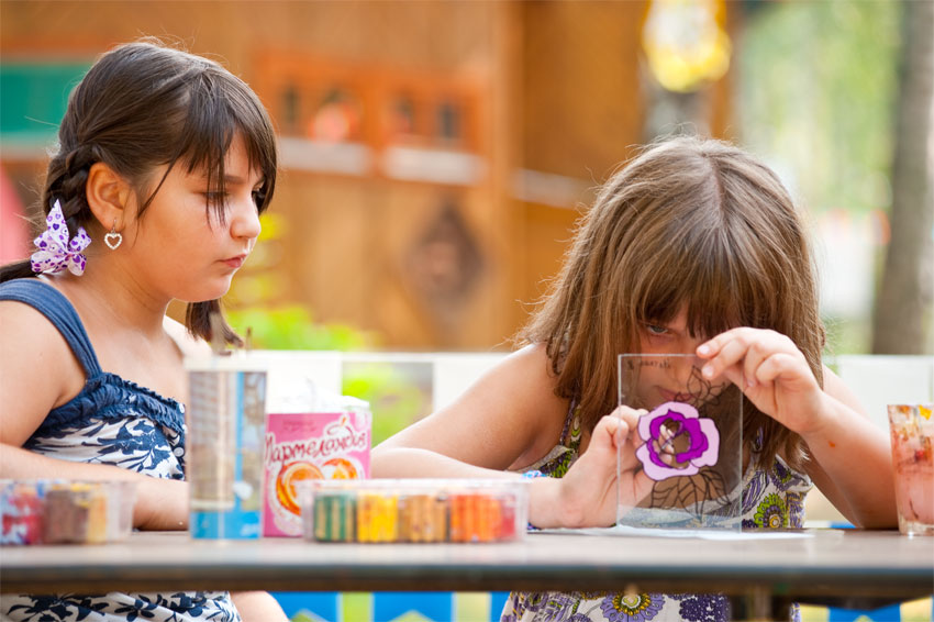 Это очень увлекательный процесс: сначала нужно выбрать картинку, перерисовать ее тушью на стекло, а потом раскрасить получившийся рисунок яркими цветами, что требует аккуратности и сосредоточенности. Так что, ожидая ребенка из лагеря, не забудьте подготовить место для его шедевра, а может даже и не одного.