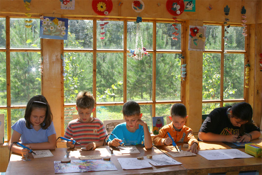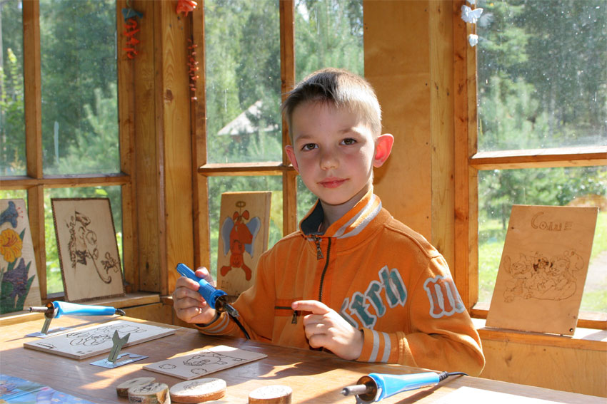 В лагере Орленок, в кружке «роспись по дереву» можно сделать замечательный рисунок на предварительно обработанной дощечке.
